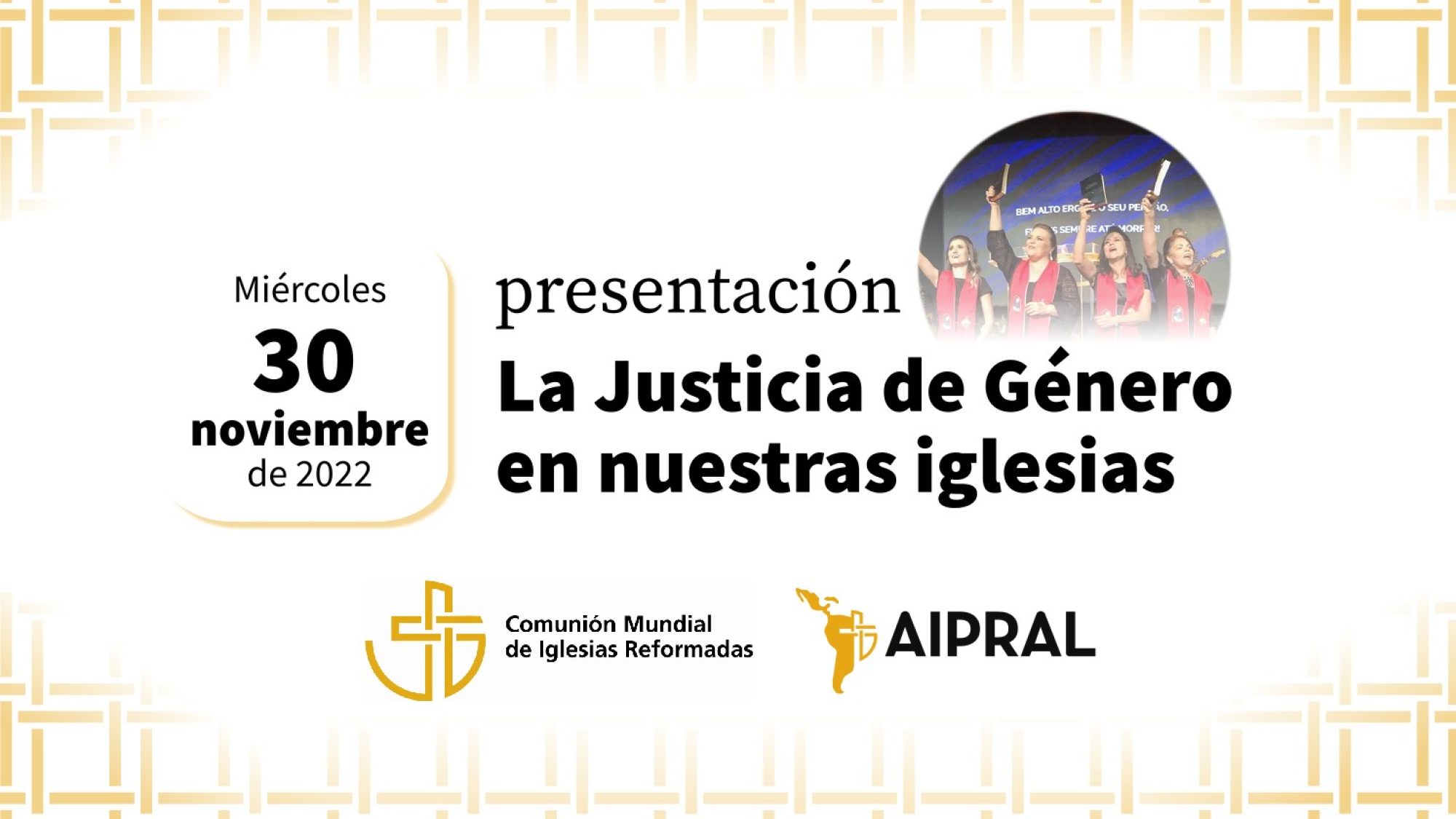 Este miércoles 30 de noviembre a través de plataforma Zoom, se desarrollará la presentación de «La Justicia de Género en nuestras iglesias», un programa de trabajo de la Comunión Mundial de Iglesias Reformadas que inicia un proceso de acompañamiento y auditoría de género para las iglesias miembros, dando continuidad a las resoluciones de la última Asamblea General de la Comunión, realizada en 2016. El encuentro de presentación cuenta con la participación de AIPRAL y procura ser una instancia de conocimiento de la propuesta, de reflexión sobre la situación de las mujeres en las estructuras eclesiásticas y de intercambio sobre las realidades de quienes participen. La convocatoria es abierta a todas las personas interesadas, previa inscripción por formulario.
